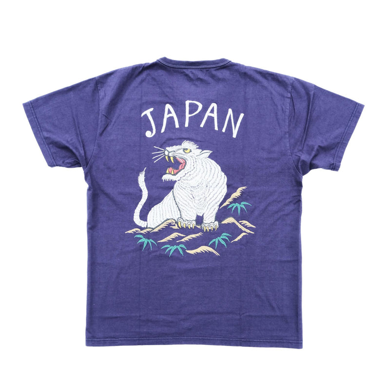 This tee stands as a powerful tribute to Japan’s postwar Sukajan (souvenir jacket) heritage. On the back, the garment showcases an intricately layered puff print so detailed it could easily be mistaken for hand embroidery. Each stroke of the tiger’s fur is rendered with lifelike depth, the print’s 3D-texture achieved through multiple overlaid passes. This gives the artwork a tactile, embroidered quality.