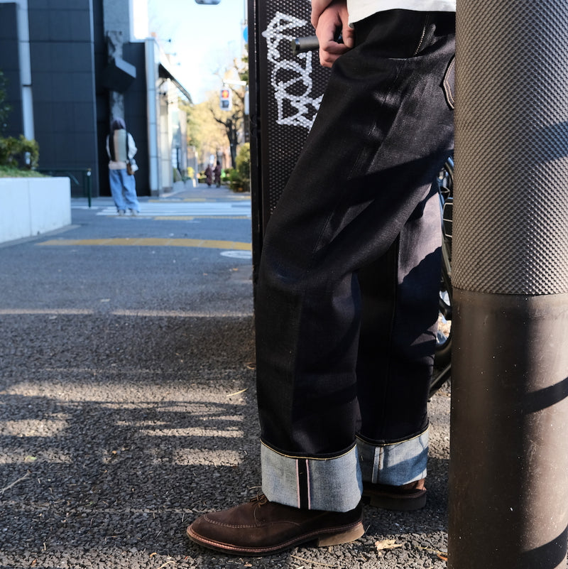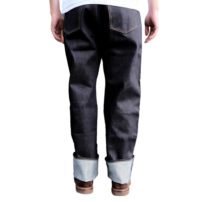 Momotaro's new lineup of standard jeans showcases the brand's dedication to creating denim featuring unique character, highlighted by the rich and intense "Tokuno Blue" indigo color. The warp threads are dyed in a deep, vivid indigo shade that defines the "Tokuno Blue" aesthetic. This rich color intensifies over time as the jeans develop their own unique fade patterns. To accentuate the indigo-dyed warp threads, Momotaro carefully selected thinner weft threads. This subtle adjustment in yarn composition enhances the prominence of the indigo while creating a refined balance of texture and color. While the denim is in its raw state, the fabric has undergone a sanforization process, ensuring minimal shrinkage.