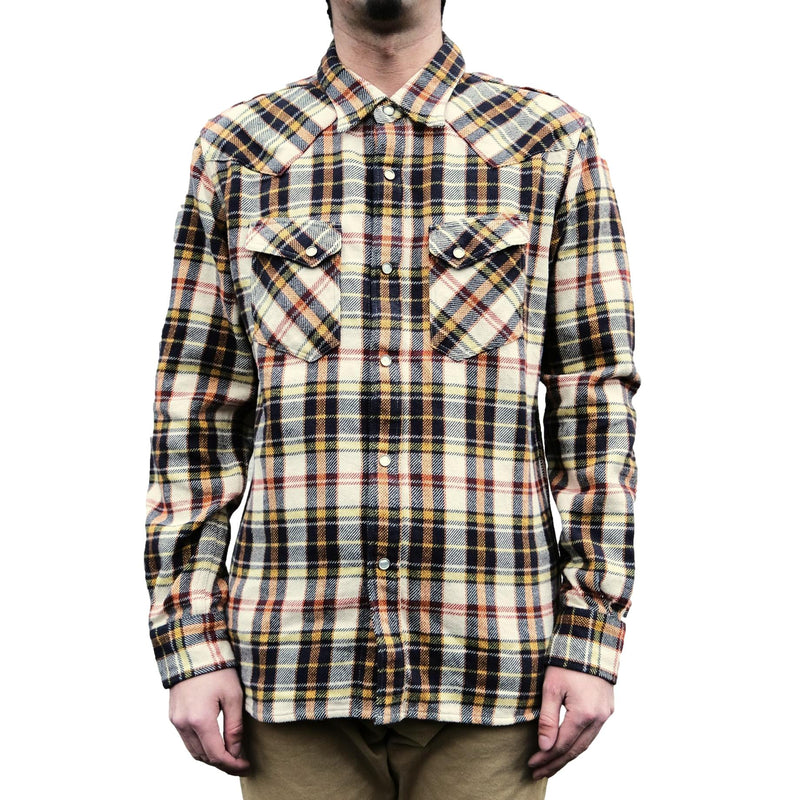 Being no strangers to the flannel game, The Flat Head come through with a Winter flannel that is equal parts heavyweight and durable. The brushed nature of the flannel fabric really gives off a crisp texture to the ivory color featured throughout. Major seams are finished with double-needle chainstitched construction, allowing the stitching to move with the fabric and form natural puckering as the shirt ages. Natural yellow Mother of Pearl snap buttons complete the design, left uncoated to highlight their shifting tones and organic character over time.