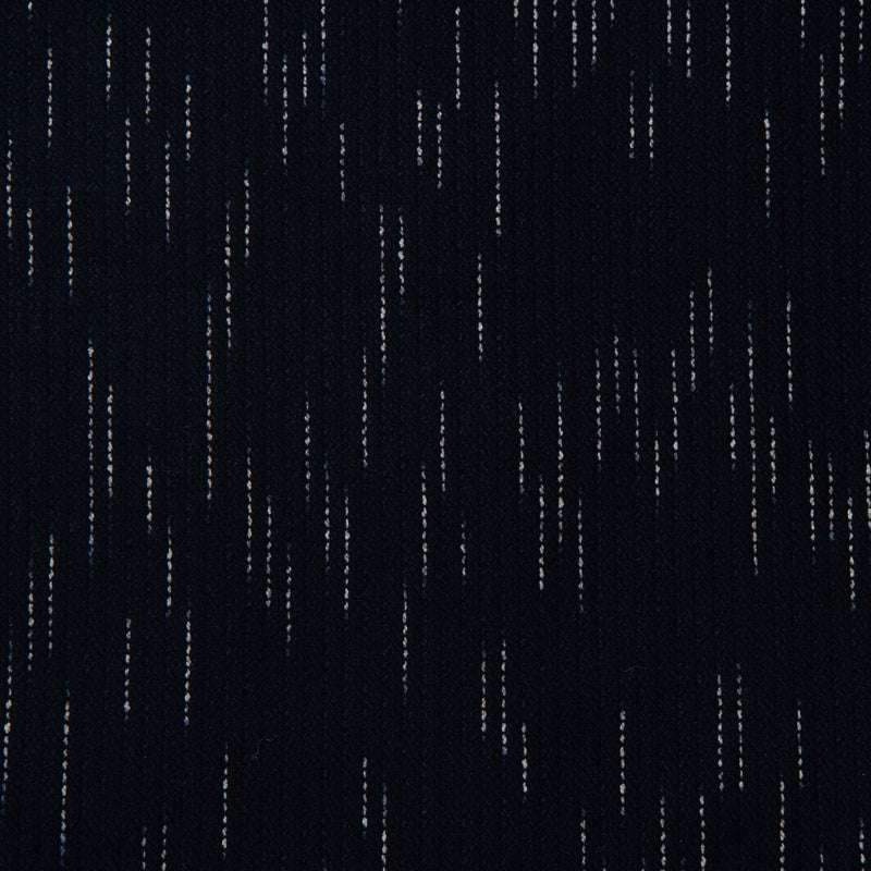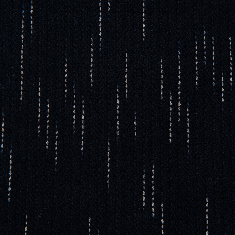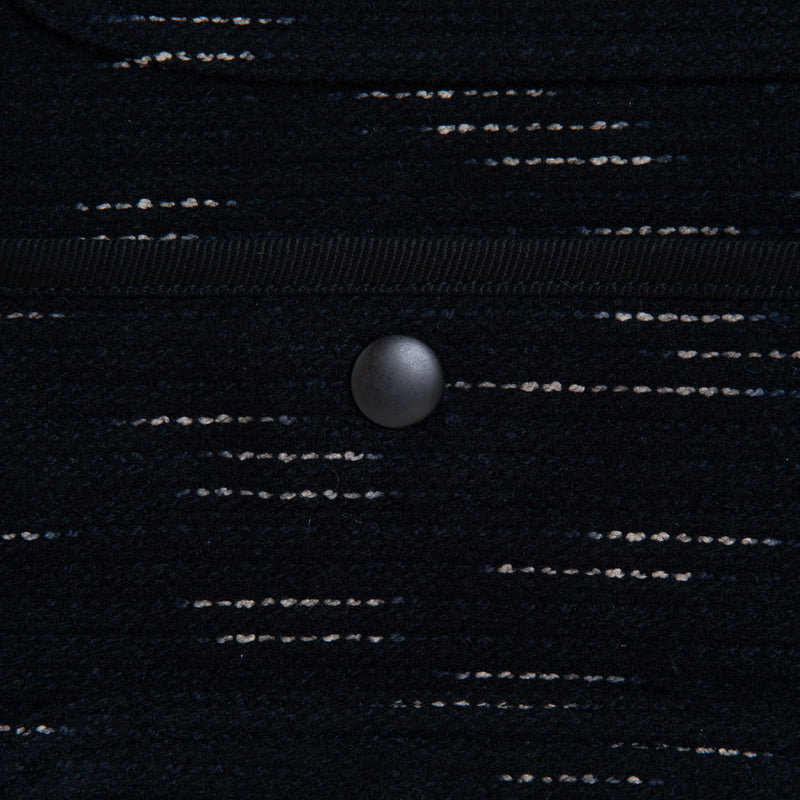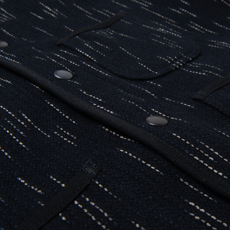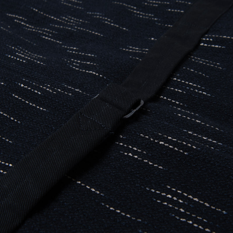 Studio D’Artisan reinterprets this iconic workwear fabric by incorporating kasuri weaving, a traditional Japanese textile technique historically used for garments. The result is the "Black Kasuri Dyed Beach Cloth," a fabric that embodies both the rugged spirit of American workwear and the artisanal beauty of Japanese craftsmanship. The kasuri-dyed warp threads create irregular, streak-like patterns, reminiscent of falling rain, adding depth and character to the fabric. For enhanced functionality, the interior is lined with wool fleece, providing superior warmth and insulation while maintaining a structured, durable feel.