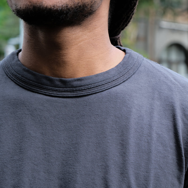 The silhouette takes its cues from 1960s classic T-shirts, with a clean crewneck shape cut for a unisex regular fit that carries just enough ease across the chest and sleeves to layer comfortably or wear on its own. The standout construction detail is the double-binder neckline, executed with a twin-needle binder stitch that doubles the ribbing for a reinforced, vintage-style collar that holds its shape over years of wear. The rest of the garment is sewn on a Union Special 36200 four-needle flatseam machine alongside two-needle seam construction throughout, a deliberately slow sewing spec that minimizes seam allowance bulk and highlights the stitch work itself.