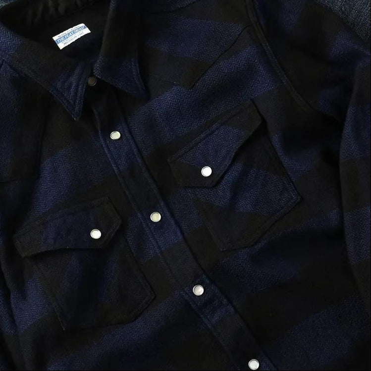 Being no strangers to the flannel game, The Flat Head come through with a Winter flannel that is equal parts heavyweight and durable. The brushed nature of the flannel fabric really gives off a crisp texture to the indigo color featured throughout. Major seams are finished with double-needle chainstitched construction, allowing the stitching to move with the fabric and form natural puckering as the shirt ages. Natural yellow Mother of Pearl snap buttons complete the design, left uncoated to highlight their shifting tones and organic character over time.
