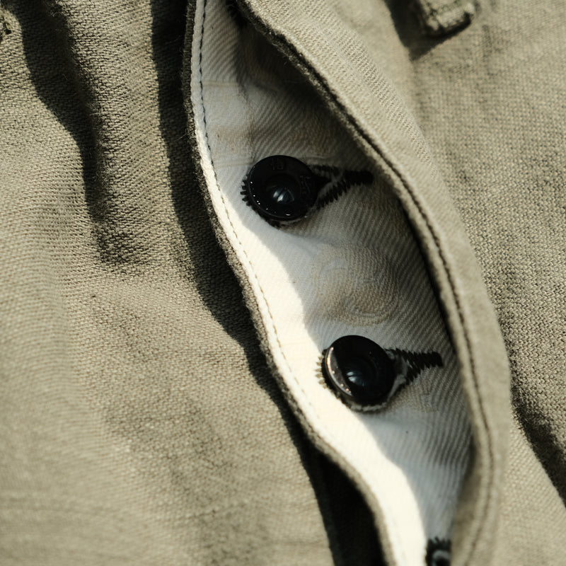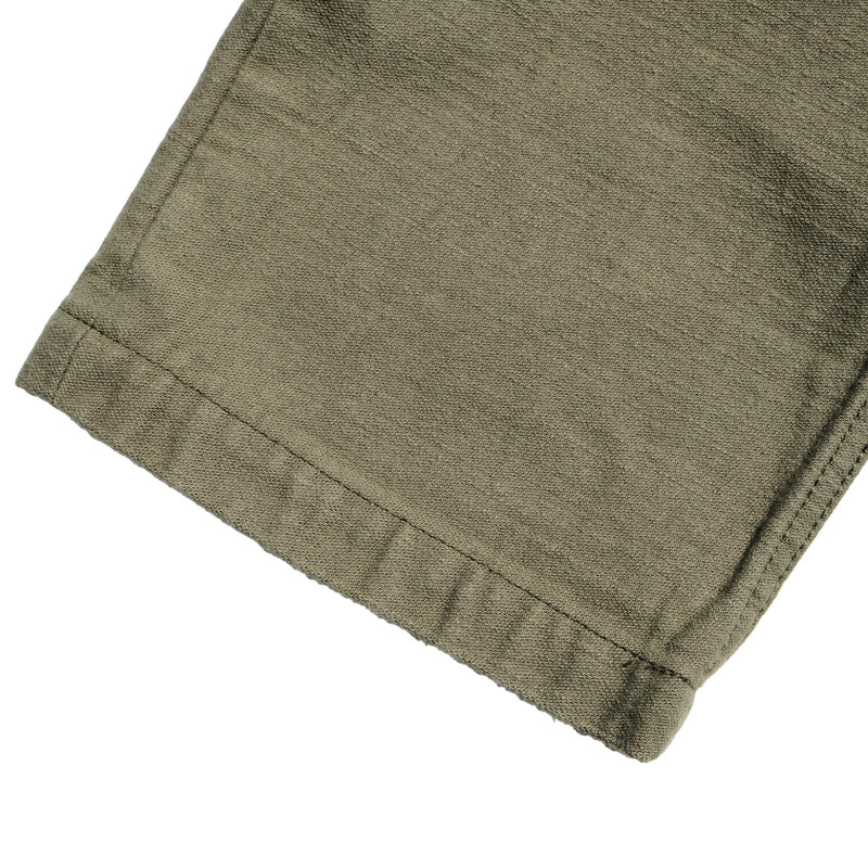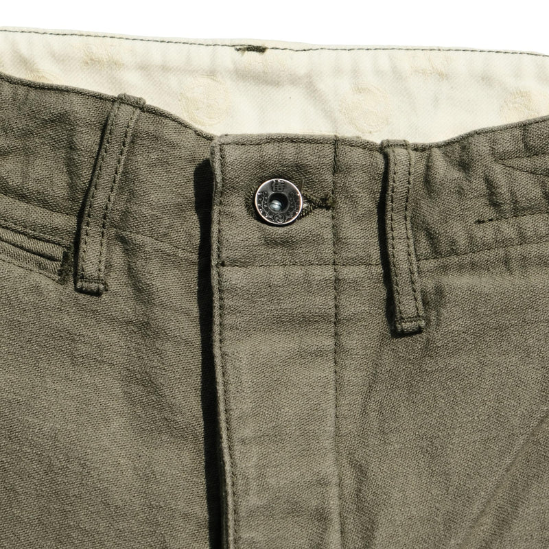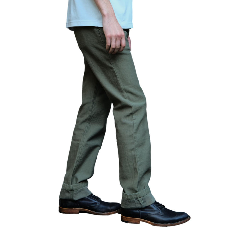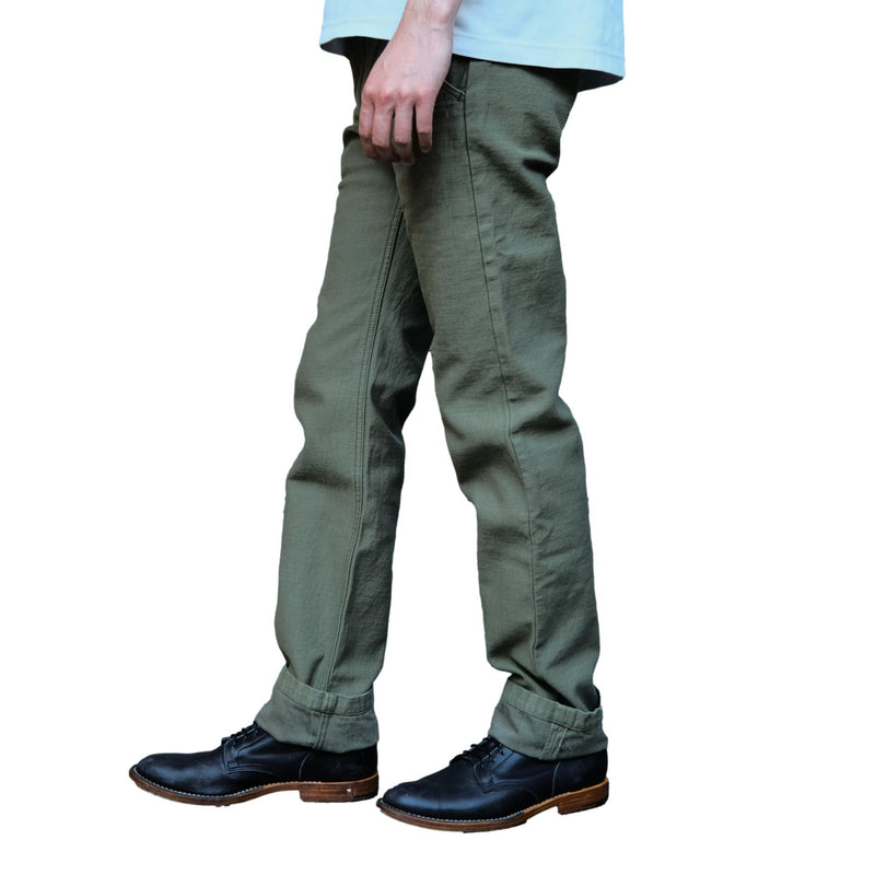 Woven using a thick sulphur-dyed No. 6 yarn dyed, this fabric is woven on a vintage power loom to produce a dense, substantial cloth that sits well outside the range of conventional chino. The back satin weave gives the fabric a smooth face with a subtle sheen, while the sulfide dyeing means the trousers will fade and develop surface contrast with wear in much the same way as raw denim, something entirely uncommon for a trouser in this category.