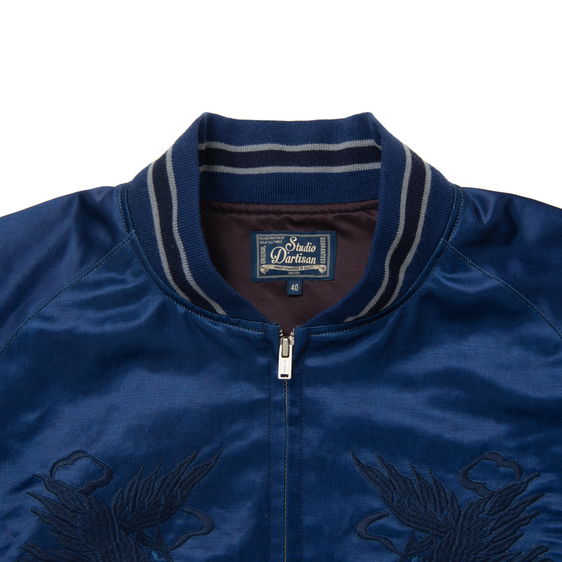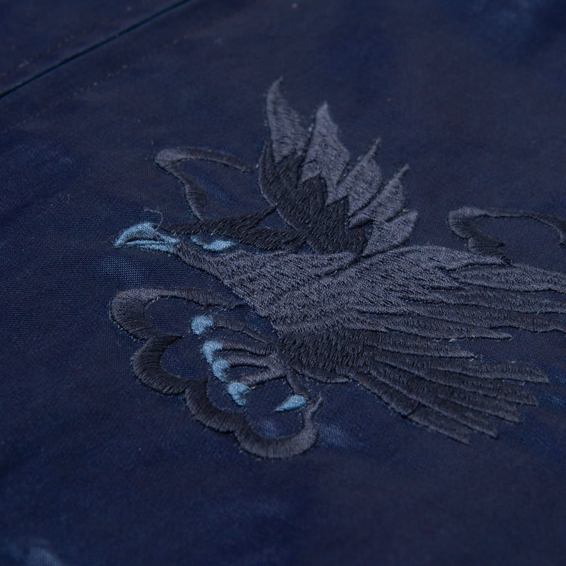 The Studio D’Artisan Indigo Dyed Sukajan Jacket is a tribute to the post-WWII origins of the souvenir jacket. This piece is truly one of a kind, utilizing a satin fabric made from a blend of rayon and cotton that has been indigo-dyed. With a higher cotton composition, the fabric offers a robust structure and substantial feel, while still retaining the smooth glossiness and elegant drape characteristics of rayon.
