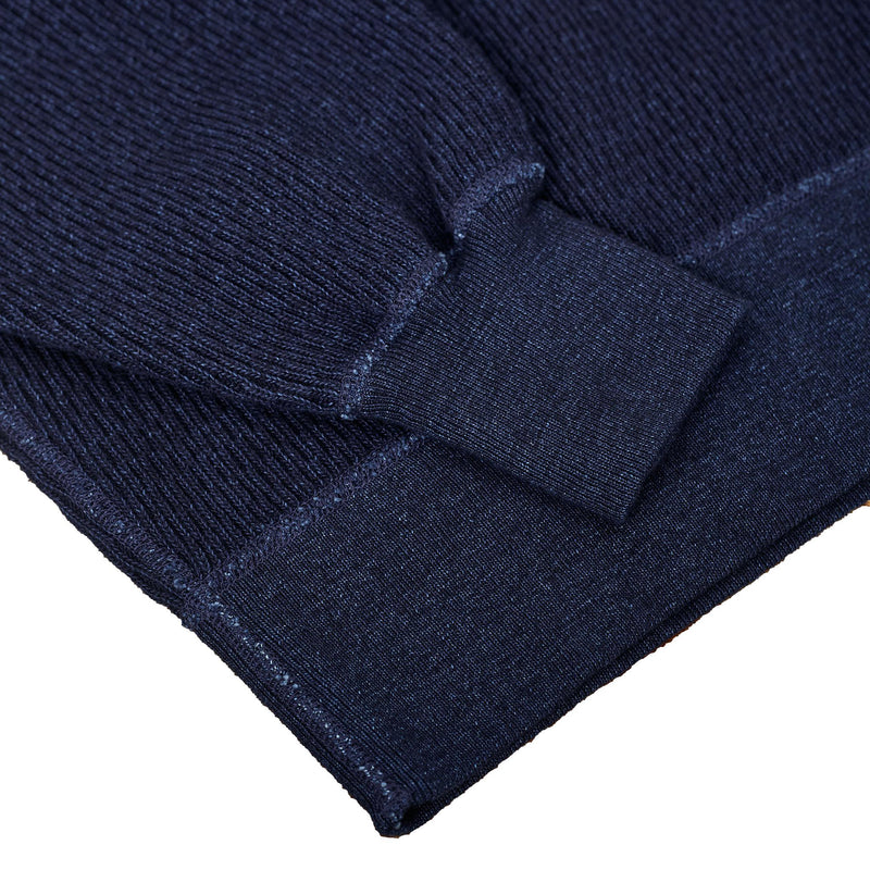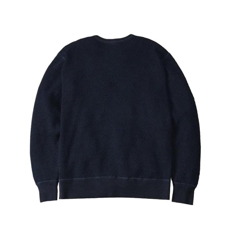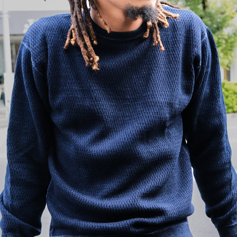 This is simply put, the eptiome of heavyweight thermals - bar none. Pushing the boundaries of traditional knitwear, this garment is woven using an ultra-heavy 23oz. thermal fabric (close to double the weight of conventional thermal fabrics). Additionally, this garment is made from rope-dyed indigo yarns that will develop a deep, beautiful patina with wear.