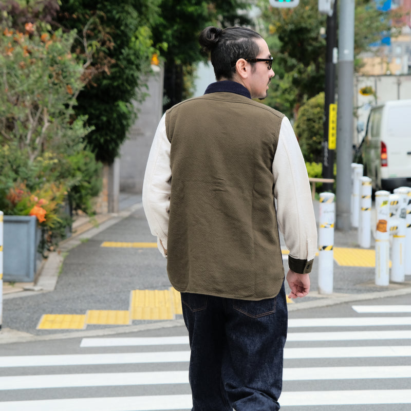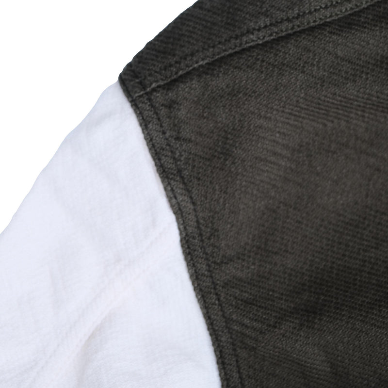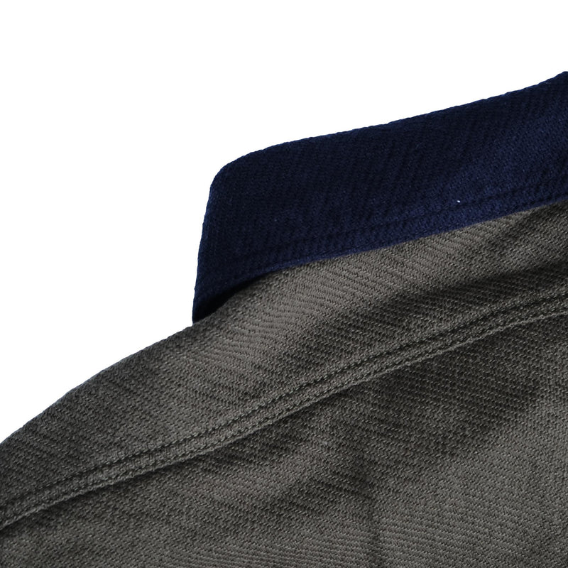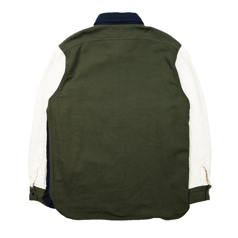 Made from heavyweight triple-yarn flannel, the fabric offers exceptional warmth, durability, and structure while maintaining a soft, brushed texture that feels comfortable against the skin. Inspired by the vibrant and unconventional artistic spirit of Peter Max, the shirt features a “crazy pattern” layout, where solid-colored flannel panels are arranged in an asymmetric, unexpected balance. Despite the playful concept, the palette remains grounded in military-inspired tones.