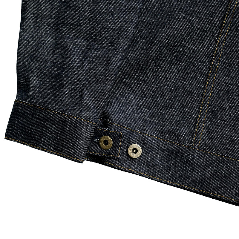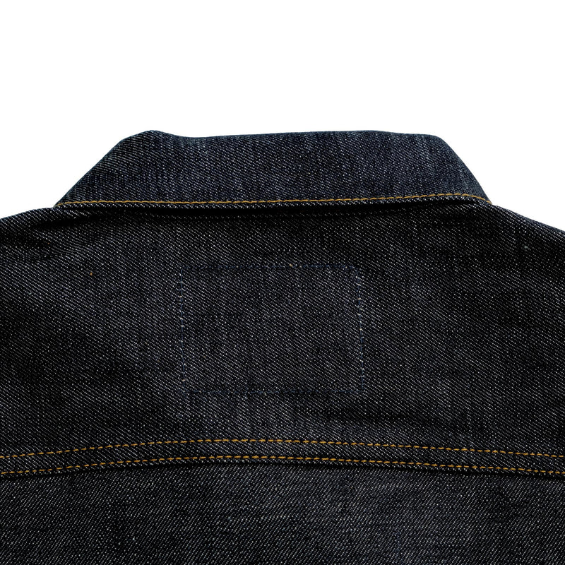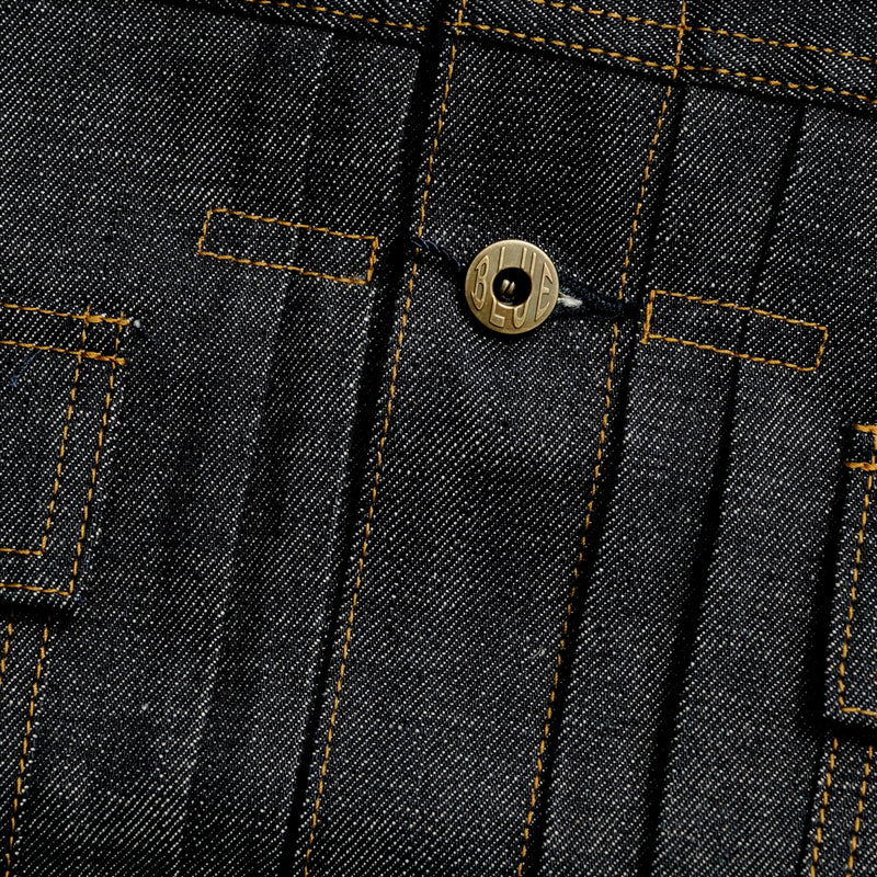 This 12.5oz. Selvedge is woven from long-staple African cotton, a fibre choice that gives the denim a notably supple and fluid hand while retaining enough body and structure to wear well as a jacket. The color is where the fabric becomes particularly interesting. A blend of natural brown cotton is worked into the construction to reproduce what Japan Blue call "old-fashioned blue," referencing the specific shade of indigo that existed in the early 1900s before synthetic indigo was developed and standardized the color. The result is a warmer, slightly earthier indigo tone than you would find on a modern denim, with a depth that comes from the natural cotton blend rather than any post-treatment.