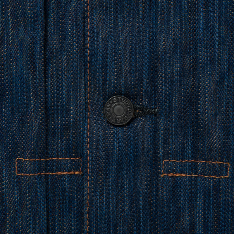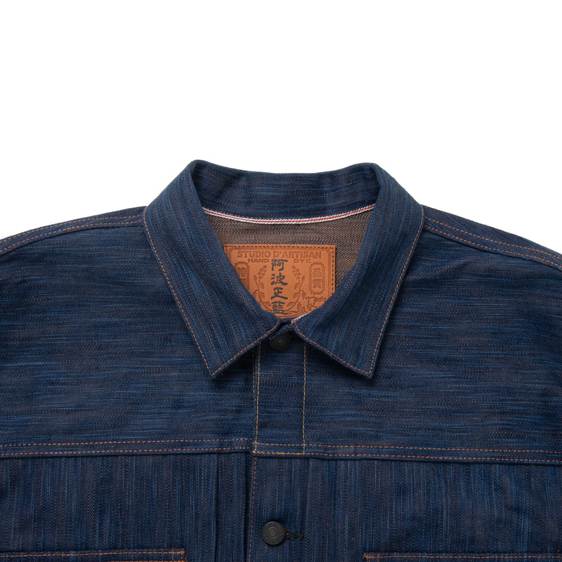 The Studio D’Artisan "Awa Sho-Ai Kakishibu" Selvedge Jeans celebrate Japan’s proud heritage of natural dyeing through the fusion of Awa Sho-Ai (阿波正藍) indigo and Kakishibu (柿渋) persimmon dye. The Awa Sho-Ai dyeing method, passed down from the Edo period, uses a unique fermentation process to produce complex hues - not just standard blue, but deep shades of green-blue, crimson, and black-indigo that evolve beautifully over time. Achieving the rich color requires a meticulous cycle of dyeing, airing, and drying, repeated multiple times to build depth and vibrancy. The final step involves washing the fabric around 30 times, refining the color into a deep, balanced tone.