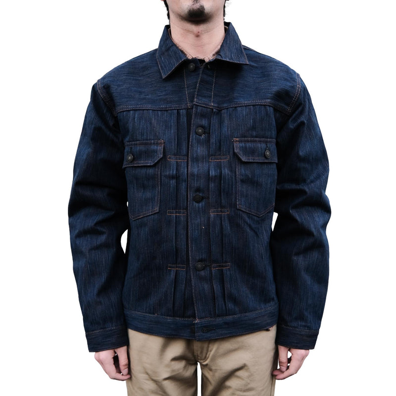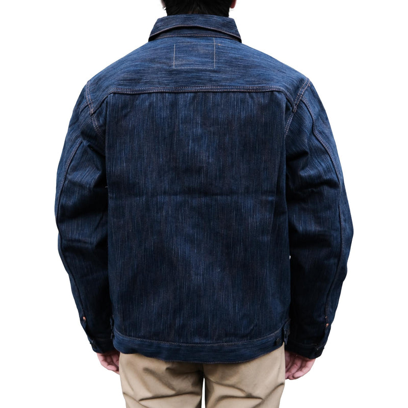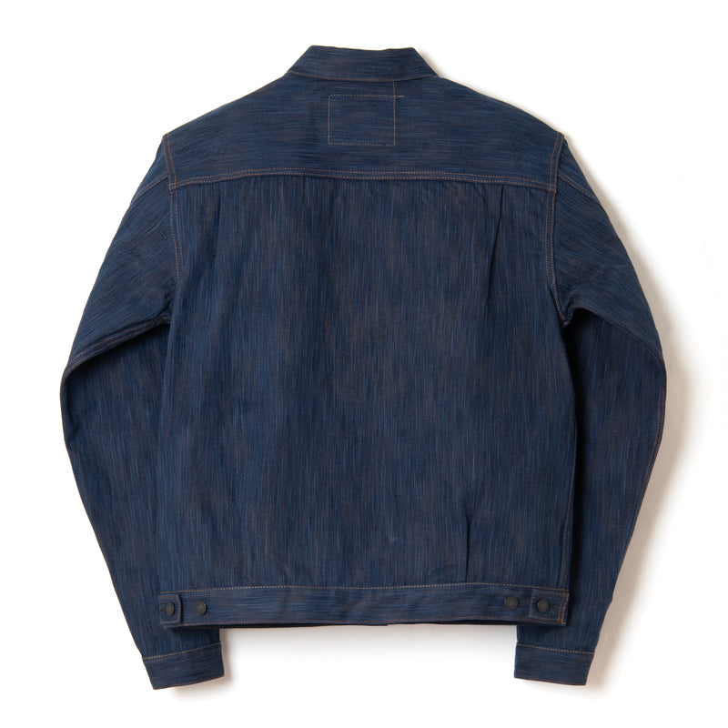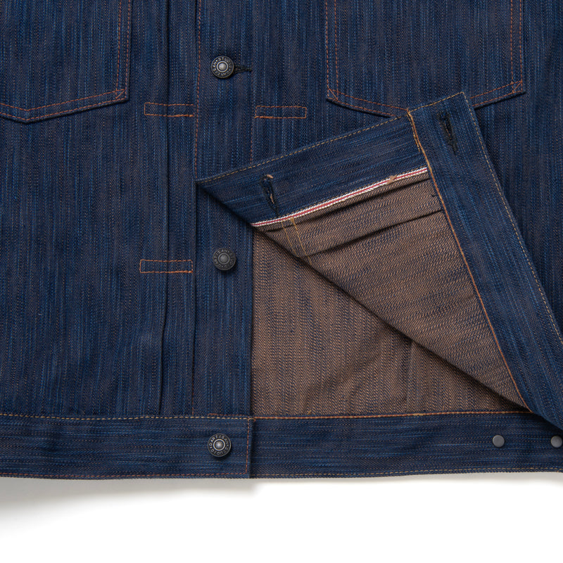 This type of indigo also carries a natural anti-bacterial and insect-repelling property, which historically made it a prized choice for clothing and textiles. Complementing this is Kakishibu dye, applied to the weft yarns through a method known as "tennen shibori" (natural sun dyeing). Exposure to sunlight and air oxidizes the persimmon dye, causing its color to evolve, adding depth and a distinctive aged character. The thicker, slub-textured Kakishibu yarns further enhance the fabric’s unique hand feel, creating a more structured, artisanal Selvedge fabric compared to standard 15oz. jeans.