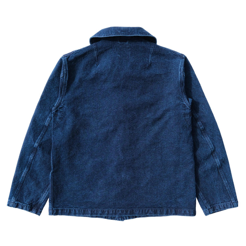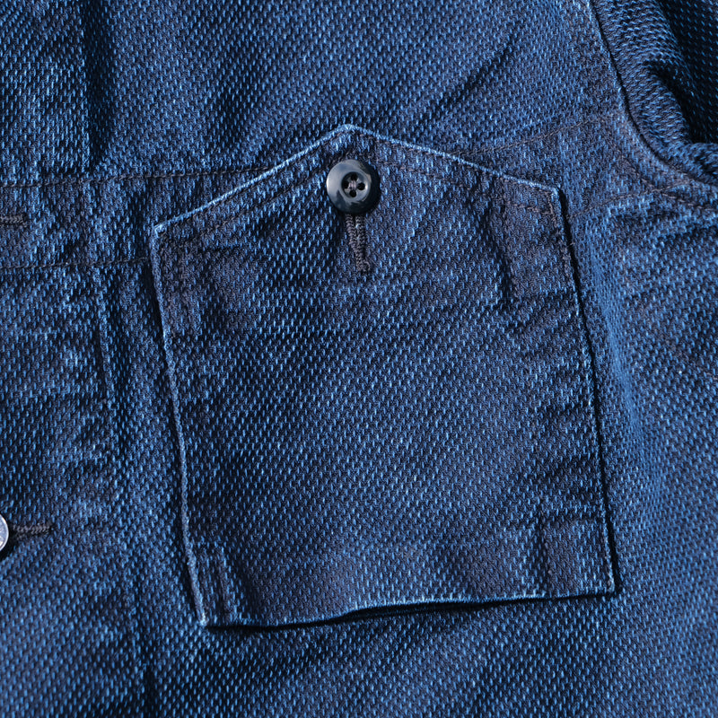 Constructed from Soundman’s signature indigo-dyed sashiko fabric, the material offers a textured hand feel with excellent durability and depth of character. An enzyme wash process has softened the fabric and enhanced the surface texture from the outset, while the embossed metal buttons feature spray paint and hand-polished aging for a subtle worn-in appearance.