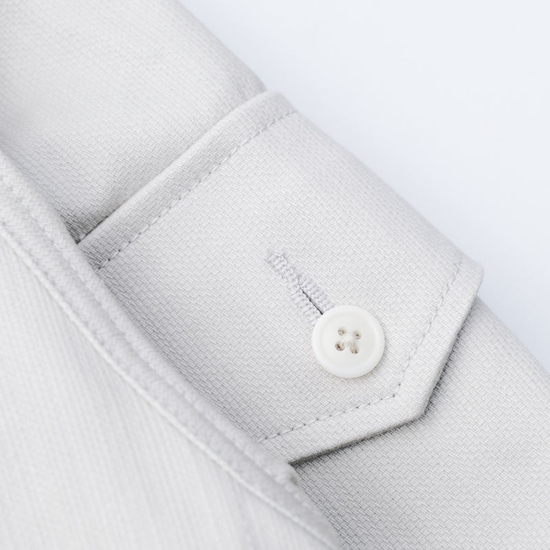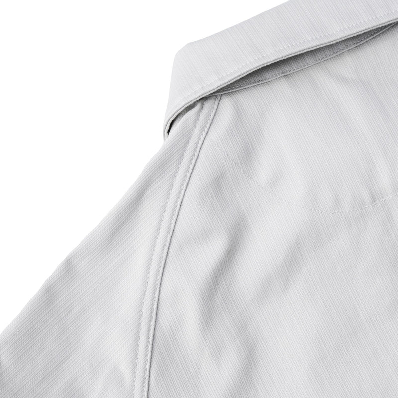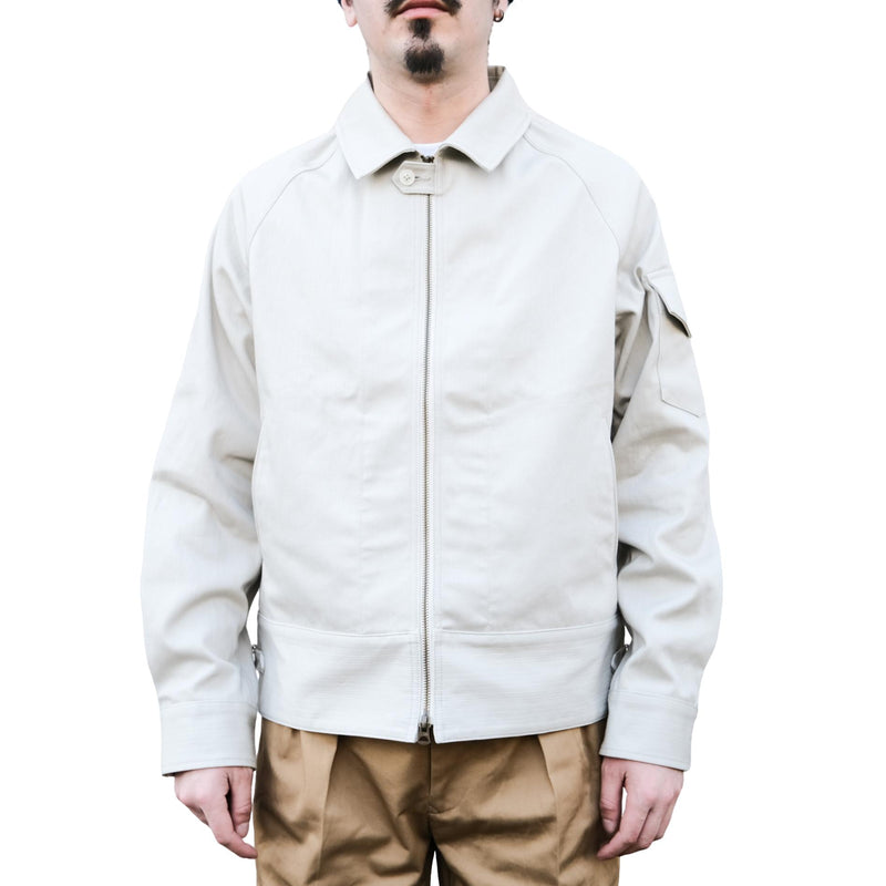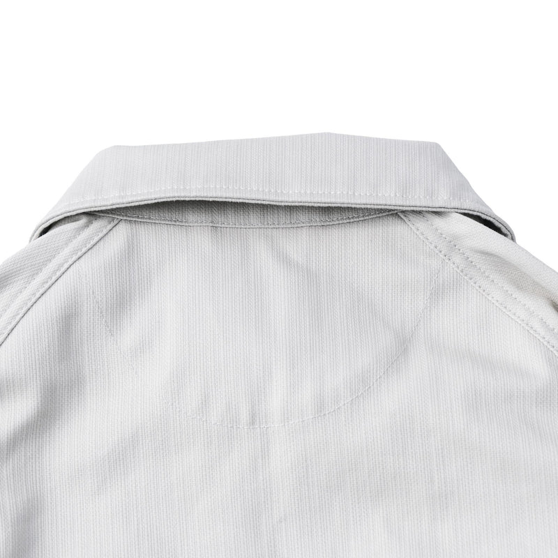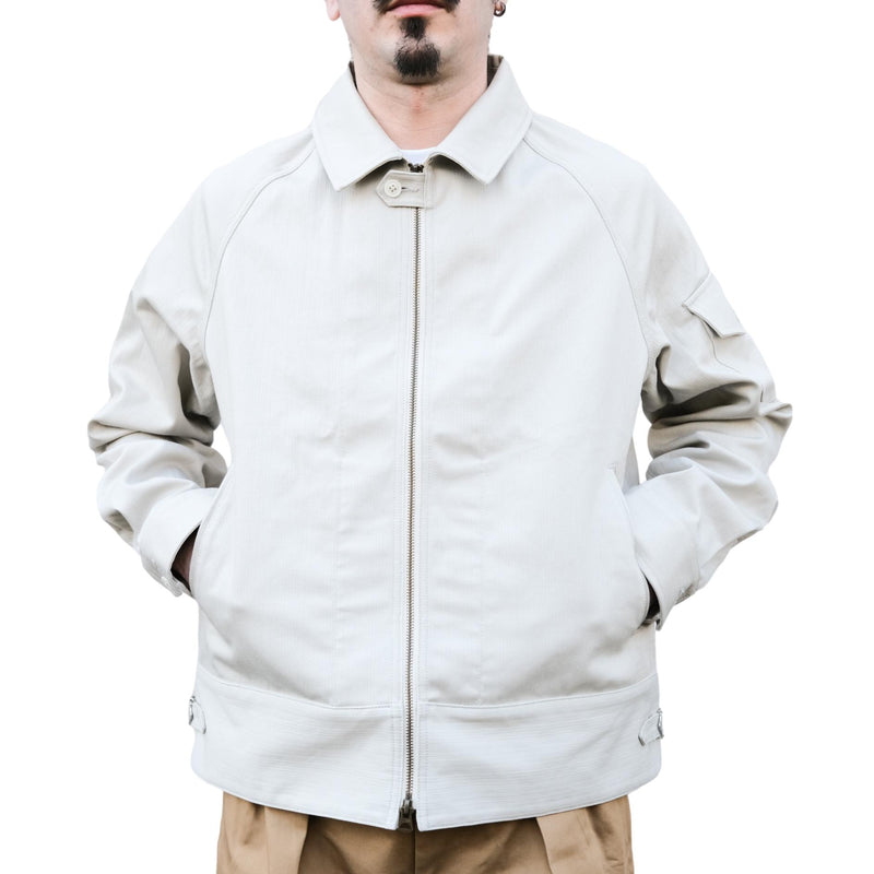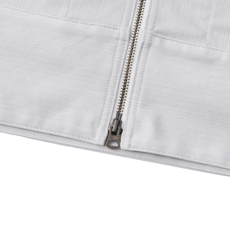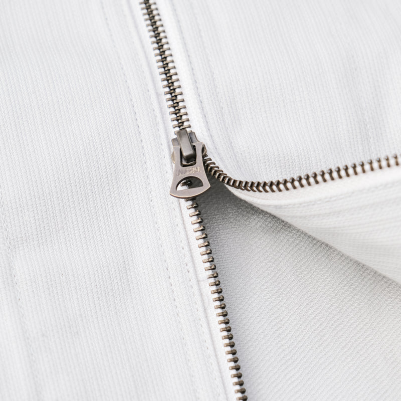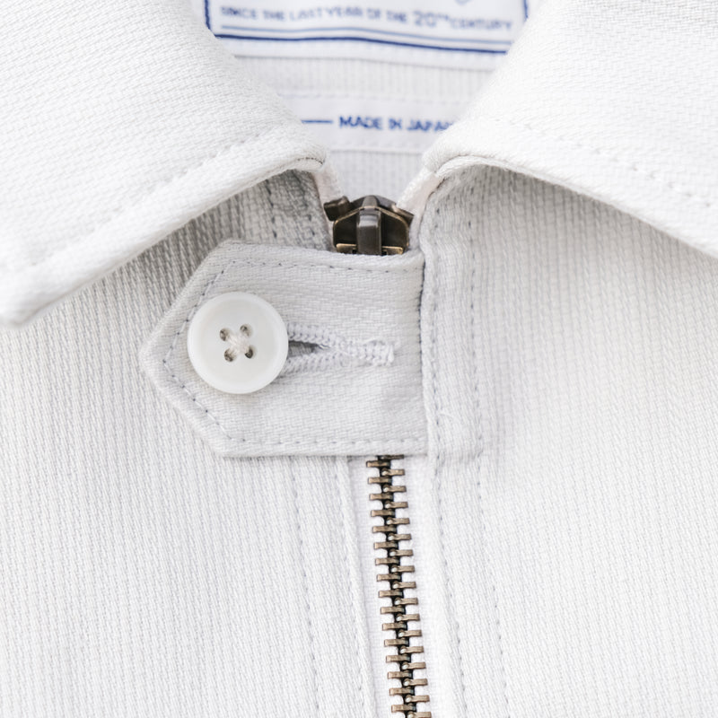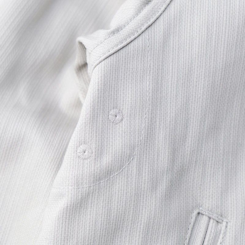 While minimal at first glance, the jacket reveals thoughtful touches upon closer inspection. A reinforced tab beneath the collar secures the zipper opening, and the waist pockets are finished with piped openings reinforced internally with traditional twine, adding durability without visual clutter. The straight silhouette can be adjusted at the hem, while the double zip front allows for versatile styling and comfort. Constructed from a random pique fabric with an uneven texture that provides depth and character, the sulphur dyed finish ensures the jacket will develop a rich patina and subtle fading with wear.